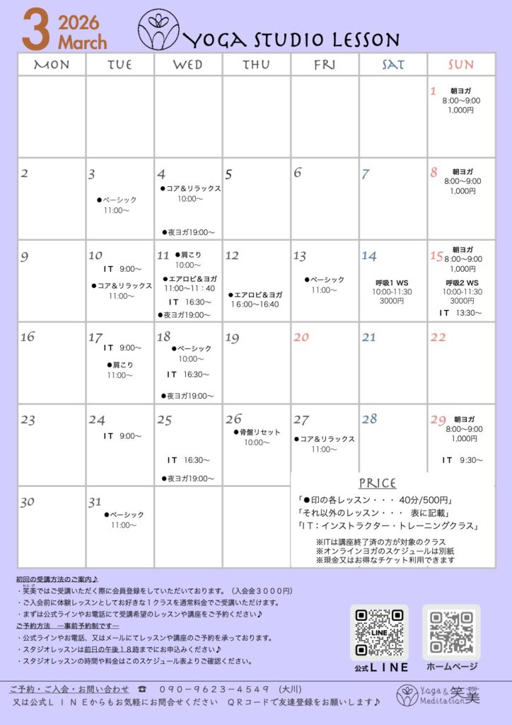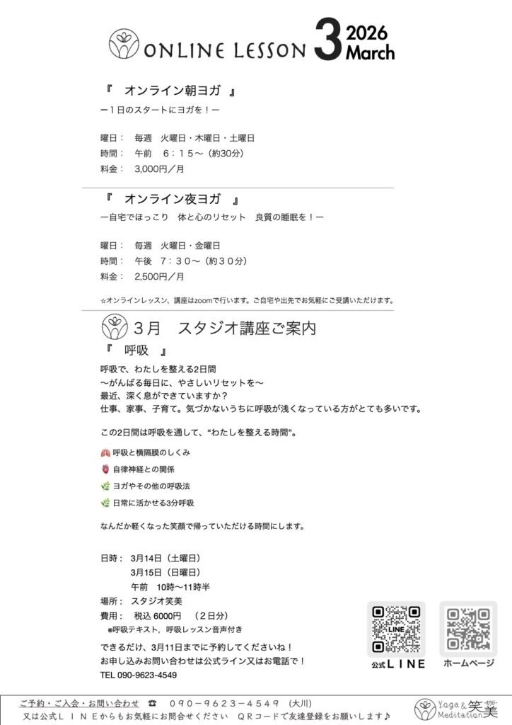 3月の予定表を公開致します。今月はスタジオやオンラインでのヨガレッスンの他にも呼吸についての講座を開催予定です。